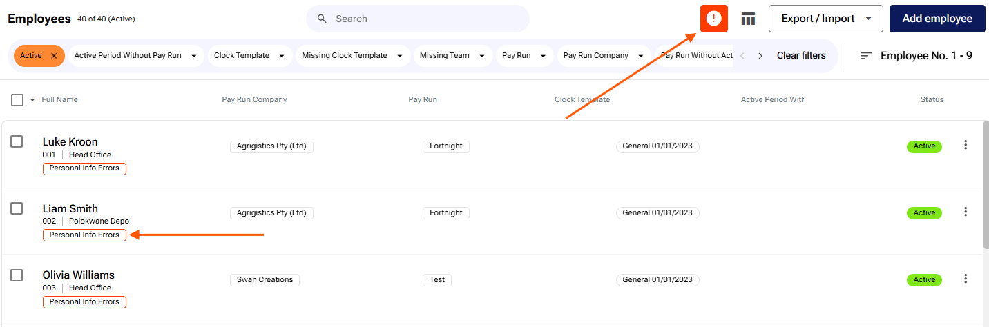 Click on the red exclamation icon next to filter to view validation errors across all your employees: